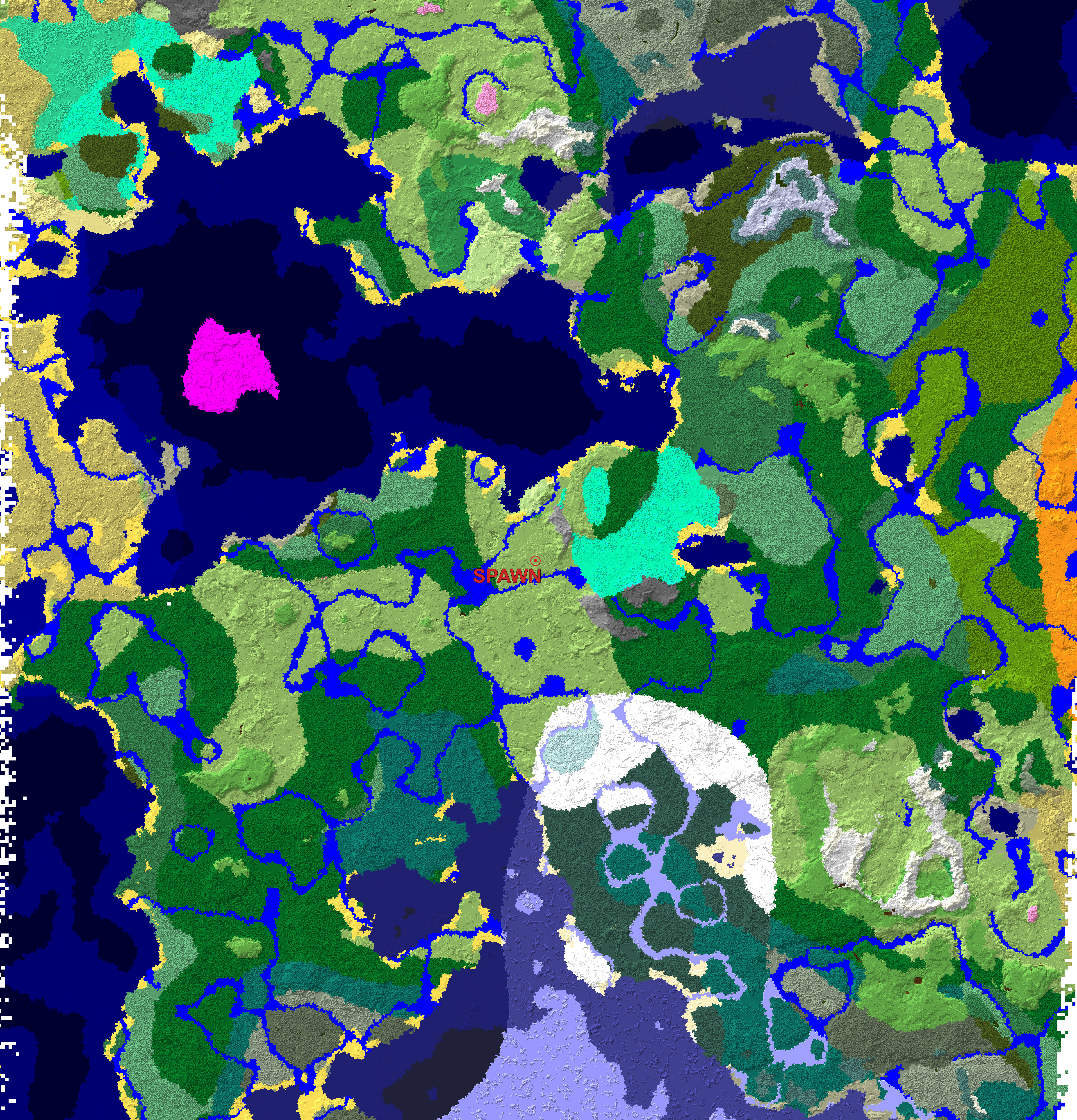 This is our world out to 2500 blocks. The world seed is 3076806040872007613. This is color coded for biomes. I don’t have a good color guide, but you can go to ChunkBase.com Biome Finder to see what the colors indicate. To mark Spawn, go to the bottom and put in X=0 and Y=0.
